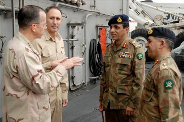 Admiral Mike Mullen (first from left), the US Joint Chiefs of Staff, Pakistani Army Chief Gen. Pervez Kayani (third from left) and next to him, the ISI Chief Ahmed Shuja Pasha (then Major Gen. and Director General Military Operations) aboard the US naval carrier Abraham Lincoln in Indian Ocean; in a secret meeting on August 26, 2008. Pasha was promoted to the rank of Lt. Gen. and appointed as the head of the Inter-Services Intelligence on Sept. 29, 2008. [Source: New Yorker]