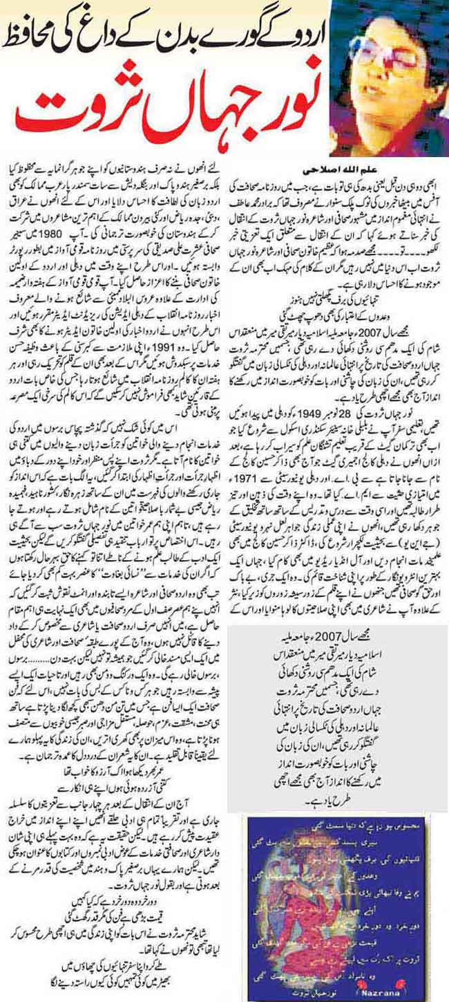 Noor Jahan Sarwat was one of the brightest students of her time and showed her creative skills while working as a teacher. She started her professional career as a lecturer in the Jawahar Lal Nehru University. She also taught at Zakir Hussain College. She was associated with the AIR as an interviewer. She was a fearless journalist and a poet with a distinct style and diction. As a poet, she represented India in various mushairas in Dubai, Reyaz, Jeddah and other countries. -- Ilmullah Islahi