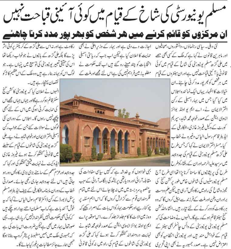 Muslim University in five towns of India said that there was no legal hurdle in the establishment of the campuses and asked everyone to extend his support to complete this gigantic task. The meeting was attended by the Bihar MLA Akhtarul Iman, the President of the AMU Old Boys Association, Khwaja Md Shahid, the Supreme Court Lawyer Feroz Ghazi and the editor of the Afkar-e-Milli, Qasim Rasool Ilyas.