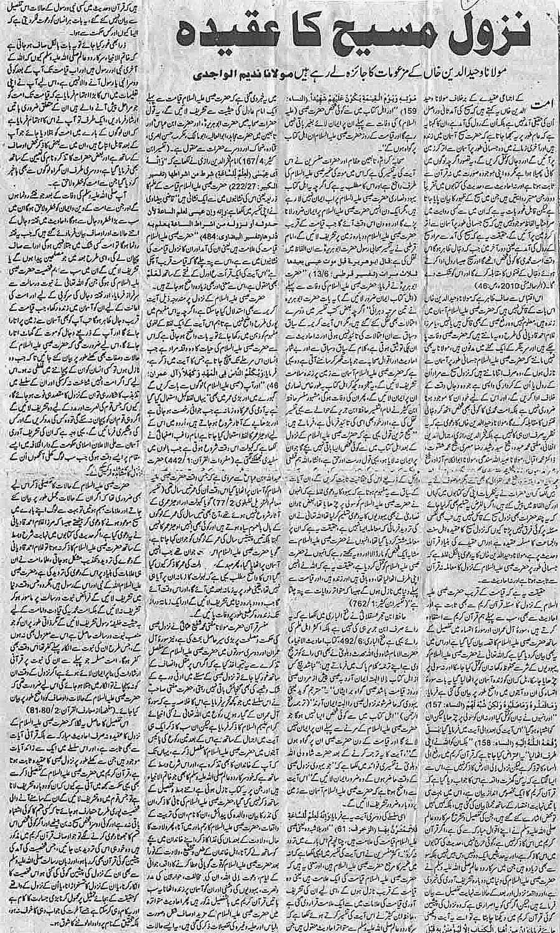 It is evident from the excerpt that Maulana Wahiduddin Khan does not believe that Jesus Christ is alive in the Heavens. I am not sure if he believes also in the ascension of Christ or not, or like Mirza Ghulam Ahmad Qadiani believes that Jesus has expired and is buried in a neighbourhood in Srinagar (Kashmir, India). The Maulana does not even believe that Jesus Christ will descend physically from the Heavens. He only believes that his descent means the coming of his role or character which he will play on the appearance of Dajjal for which his physical presence is not needed. A member of the Muhammadi ummah will rise and fight him. Maulana Wahiduddin Khan claims that this is not his personal point of view but subscribed also by Fakhruddin Raazi, Jamaluddin Afghani, Mufti Mohammad Abdah, Sheikh Syed Rasheed Raza Misri, Sheikh Mohammad Shaltut, Dr Mohammad Iqbal, Maulana Obaidullah Sindhi, Maulana Abul Kalam Azad, Sheikh Mohammad Bin Ahmad Abu Zahrah, Sheikh Mohammad Al Ghazali. But he has not written in which books and in what words have they presented their points of view. Even if we suppose that these few personalities also do not believe in the physical descent of Christ, it does not have any bearing on the core of the issue as the belief of the descent of Christ is an established belief of the Ahl-e-Sunnat Wal-Jama'at which is based on the Quran and Hadith. Maulana Wahiduddin Khan’s claim that the physical descent of Christ is not proved by the Quran and the Hadith is false.