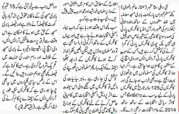 It goes without saying that the RSS and the VHP had been trying to acquire the land of the mosque for the temple. For this purpose, they have been in touch with greedy ulema for a long period but they could not achieve much. Now they are trying hard to achieve their goal with the help of Salman Khurshid and Mohammad Adeeb at the cost of the Congress. But given the circumstances, the attempts of Salman Khurshid and Mohammad Adeeb will fail and the Congress will ultimately suffer a huge loss.