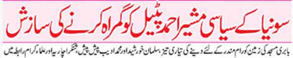 Influenced by the suggestions of Salman Khurshid and Mohammad Adeeb, perhaps Ahmad Patel too has now begun to think that an appropriate solution to this dispute is handing over of the Babri Masjid land for Ram Mandir. According to reports, the former President of the Muslim Personal Law Board Ali Mian Nadvi is also in favour of the settlement of the issue with mutual agreement. Reports say that Salman Khurshid is also in contact with other parties.