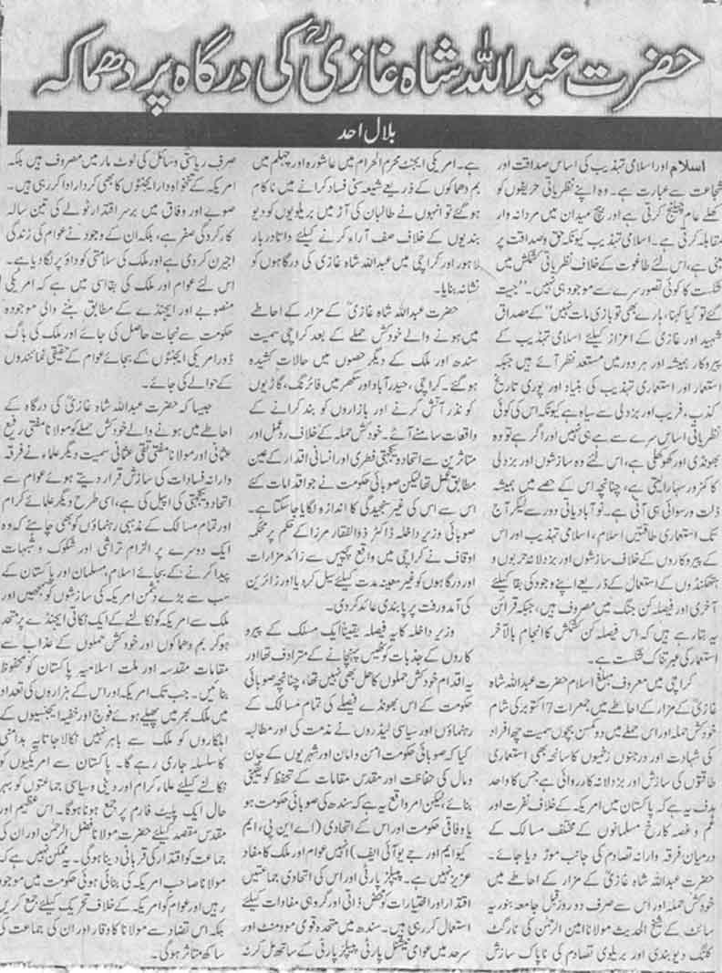 The unfortunate event of the suicide attack in the complex of the mausoleum of the famous Islamic preacher Hadhrat Abdullah Gazi on the evening of October 7 in which two innocent children were martyred and dozens got injured is also the conspiracy and an act of cowardice of the imperialist forces aimed at diverting the hatred against the US in Pakistan towards the communal violence among the various sects of the Muslims. The blast at the mausoleum of Hadhrat Abdullah Gazi and the target killing of Sheikh al Hadith of Jamia Banuria site just two days earlier is an unholy conspiracy to cause Deobandi-Bareillvi confrontation. When the American agents failed to cause Shia-Sunni riot in the month of Muharram by carrying out blasts on Ashura and Chahallum, they targeted the Data Darbar in Lahore and the Dargah Hadhrat Abdullah Gazi in Karachi under the cover of Taliban to pitch the Bareillvi’s against the Deobandis.