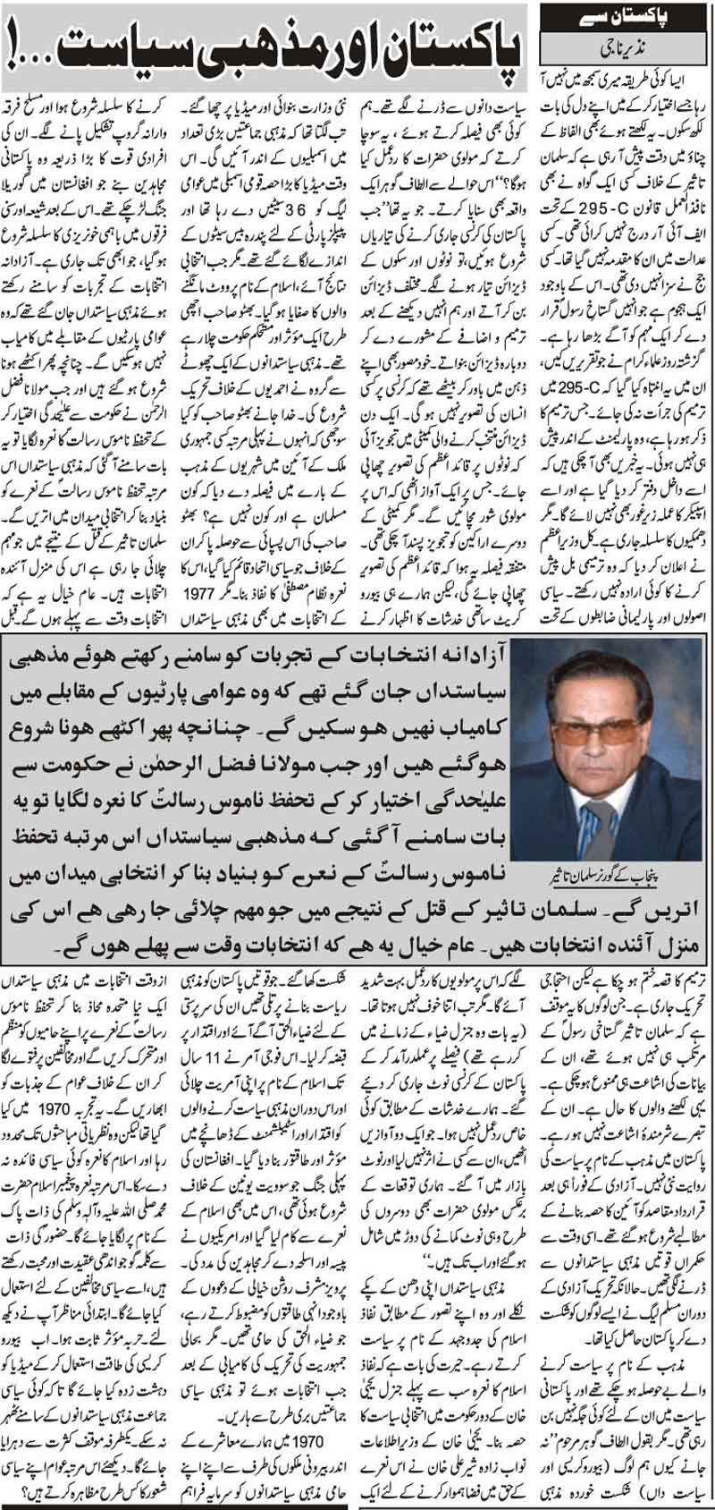 By Nazeer Naji I cannot think of a way of pouring my heart out. I cannot choose words to express the fact that not a single witness had registered an FIR under 295-C against Salman Taseer. No case had been filed against him in any court. No judge had convicted him. Nevertheless there is a mob that is running a campaign by declaring him a blasphemer. Recently, the ulema delivered lectures warning the government against amending the law 295-C. The amendment being debated has not been presented in the Parliament in the first place. It has also been reported that the file has been closed and the staff of the speaker will not even consider it. But the threats have not stopped. The Prime Minister made it public yesterday that he does not have any plans to present the amendment bill. The matter of amendment according to principles and rules of the Parliament has been put to rest but the protests and demonstrations are going on. The publications of statements of those who think that Salman Taseer was not guilty of blasphemy at all have been banned. This is the dilemma with the writers as well. Their comments are not being published. The tradition of politics in the name of religion is not new in Pakistan. The demand of making the Objectives Resolution a part of the Constitution was being made right with the establishment of Pakistan. The ruling class had become under pressure of the religious politicians right from the beginning, though the Muslim League had attained Pakistan by defeating these people during the freedom struggle. The people playing politics in the name of religion had lost their morale and they were not finding any place in Pakistan politics. But in the words of late Altaf Gauhar, “I don’t know why we (the bureaucracy and the politicians) were scared of the religious politicians. While taking any decision, we would think what the reaction of the maulvis was going to be”. In this connection, Mr Altaf Gauhar would narrate a story: When the preparations of the issue of Pakistani currency started, the designs of notes and coins were being made. Various designs would be presented to us and we would suggest modifications and then finalise designs. The artists had themselves had got the idea that there would not be an image of any human being. One day the committee for the selection of design came up with the proposal that the image of Qaid-e-Azam should be on the notes. The immediate response was that the maulvis will raise a hue and cry. But the proposal had taken the fancy of the other committee members. The decision to publish Qaid-e-Azam’s picture was then taken unanimously. But our bureaucrat colleagues expressed the apprehension that there will be strong reaction from the maulvis. But there was not an intense fear. (He was talking about this during Zia regime). Acting on the decision, the currency notes were issued. There was no particular reaction as was feared. A couple of voices were raised but no one noticed them. Contrary to our apprehensions, the maulvis joined the race to earn the same notes alongwith others and are doing so even today.” Religious politicians continued to do politics in the name of struggle for the implementation of religion. It is surprising that the slogan of implementation of Islamic Sharia became a part of election politics in Pakistan during the reign of Gen Yahya Khan. The Information Minister of Gen Yahya Khan, Nawabzada Sher Ali Khan got a new ministry formed to pave the way for this slogan and became a darling of the media. It appeared at that time that the religious parties would make it to the Assemblies in large numbers. A large part of the contemporary media had already assigned 36 seats to the Awami League and 15-20 seats had been anticipated for the People’s Party. But when the election results were out, the people asking for votes in the name of Islam were wiped out. Bhutto was running an efficient government. A small group of religious politicians started a movement against the Ahmadis. For the first time in the Constitution of a democratic country it was incorporated who was a Muslim and who was not, a move by Bhutto that baffled many. Taking heart from Bhutto’s move, a political alliance was formed that demanded the implementation of Nizam-e-Mustafa. But even in the elections of 1977 the religious politicians faced defeat. Ziaul Haque came forward to lead the forces who were hell-bent on making Pakistan a religious state and captured power. This army dictator run his dictatorship in the name of Islam for eleven years and the religious politicians were made powerful within the frame work of the establishment and government. The first war of Afghanistan that started against the Soviet Russia was fought with the slogan of Islam and the Americans helped the mujahideen with weapons and money. Perwez Musharraf strengthened the same forces that supported Ziaul Haque despite his claims of broadmindedness. But when the elections were held after the return of democracy, the religious parties faced big defeat. In 1970, the tradition of providing funds to political leaders started on the lines of the foreign countries and communal groups kept coming into existence. The main source of the man force for these groups was the warriors who had fought guerilla war in Afghanistan. The series of Shia-Sunni bloodshed started after that which is going on even today. In view of the free and fair elections, the religious politicians had realized that they will not be able to succeed against the mainstream political parties. So they have started coming together and when Maulana Fazlur Rehman raised the slogan of the protection of the sanctity of the Prophet (PBUH), it became clear that this time the religious politicians will come onto the elections field with the issue of blasphemy laws. The campaign being run following the assassination of Salman Taseer has next elections as its goal. A common view is that the general elections will be held befo
