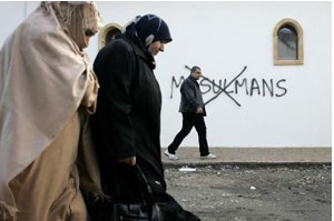 Ba’asyir will only appear to hear religious expert 40 injured as Jamaat men, cops clash in city Pak- US caught in another diplomatic row US doubts Pakistan's plan to defeat Taliban Zardari for determined efforts to better ties with India Obama backtracks, 9/11 accused to face military trial Gulf States step up diplomacy efforts to end crisis in Yemen Bush invited Osama's son to White House to nab elusive Dad Libya rebels slam NATO, Gaddafi offers talks Fresh furore over France’s Muslims as veil ban looms Pakistan failing to defeat militants: WH Yemen’s Saleh urges Opp talks amid clashes Pope mourns death of Indian cardinal Qaddafi planned to crush protests by killing civilians, says ICC Libyan Govt says Gaddafi won’t step down Libya will talk with unarmed rebels: official Islamists look for gains in Egypt's freer politics Palestinian killed by Israeli fire in north Gaza NATO oil tankers attacked in Pakistan: officials Dozens reported killed in Abidjan violence: UN Cameron adds to Mush worries, says may extradite him Legal experts express concern over new Turkish bill on sex crimes Rebels regain oil hub & prepare to export crude Sarkozy to take up Yunus issue with Bangladesh 2 Bangladeshi peacekeepers die in Congo plane crash Turkey, Indonesia call for Libya ceasefire Afghan civilian killed in Taliban-police gunfight Airstrike hits Libyan military convoy near Brega Libya open to reform, rebels pushed back No letup in deadly clashes; Saleh to attend Saudi talks Fayyad says Palestinian institutions ready for statehood Obama, Shimon Peres discuss Middle East peace US still committed to closing Guantanamo: White House Angelina visits Tunisian-Libyan border US commander: Libya mission upset some in Africa Compiled by New Age Islam News Bureau Photo: Muslim residents walk past racial slurs painted on the walls of a mosque in the town of Saint-Etienne, central France. | ||