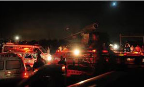 Earlier, about 15 terrorists, armed with rocket-launchers and hand-grenades, attacked the PNS Mehran, located on Sharea Faisal, late on Sunday night, killing at least two naval officials and injuring as many besides destroying a US made maritime partrol Orion aircraft on the premises.