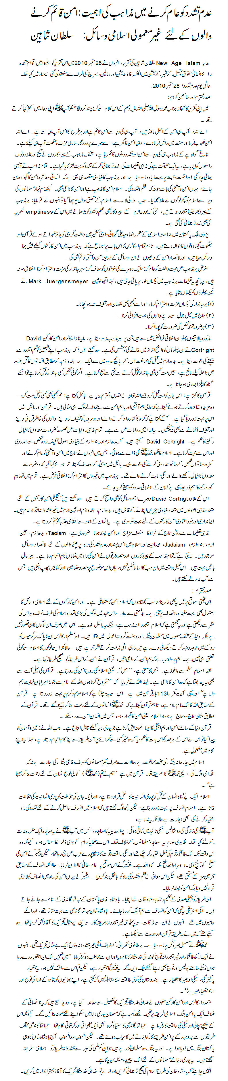 Following the Prophet’s example, in the last century, the great leader of the then united India’s northwest frontier province, which is now known as Pakistan’s province of Khyber-Pakhtunkwa, Badshah Khan devised a strategy that harmonised the demands of a quest for Justice with the interests of peace. He was inspired by the Mahatma and was his greatest, most unflinching ally. But he had worked out his strategy of non-violent struggle and started his unique movement before meeting him. He said he had learnt this from his study of Quran and Hadith. He found his nonviolent strategy in Islam’s call for an unrelenting struggle against injustice and the Prophet’s constant exhortation for patience and perseverance. He brought the two virtues together and thus was born his unique movement of non-violent resistance against British colonial rule. He told his 100,000 strong non-violent army of khudai khidmatgars (Servants of God): “I am going to give you such a weapon that police and the army will not be able to stand against it. It is the weapon of the Prophet, but you are not aware of it. That weapon is patience and righteousness. No power on earth can stand against it. …tell your brethren that there is an army of God and its weapon is patience….”[xxv] Many scholars and peace activists who have studied the Khudai Khidmatgar movement in detail consider this as an Islamic model for non-violent struggle against injustice. Let us hope that Muslims all over the world take this as a model that is as relevant today as it was a century ago. -- Sultan Shahin, Editor, New Age Islam speaking at a parallel seminar organised by Al-Hakim Foundation and Himalayan Research in the UN Human Rights Council’s September 2010 session at Geneva on the International Day of non-violence:28 September 2010