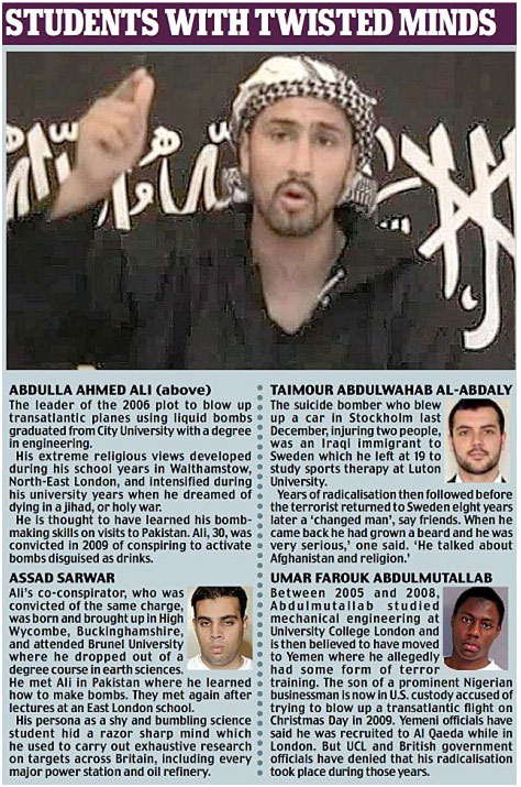 Two of the fanatics convicted of the transatlantic liquid bomb plot – ringleader Abdulla Ahmed Ali and Assad Sarwar – attended City and Brunel Universities respectively.