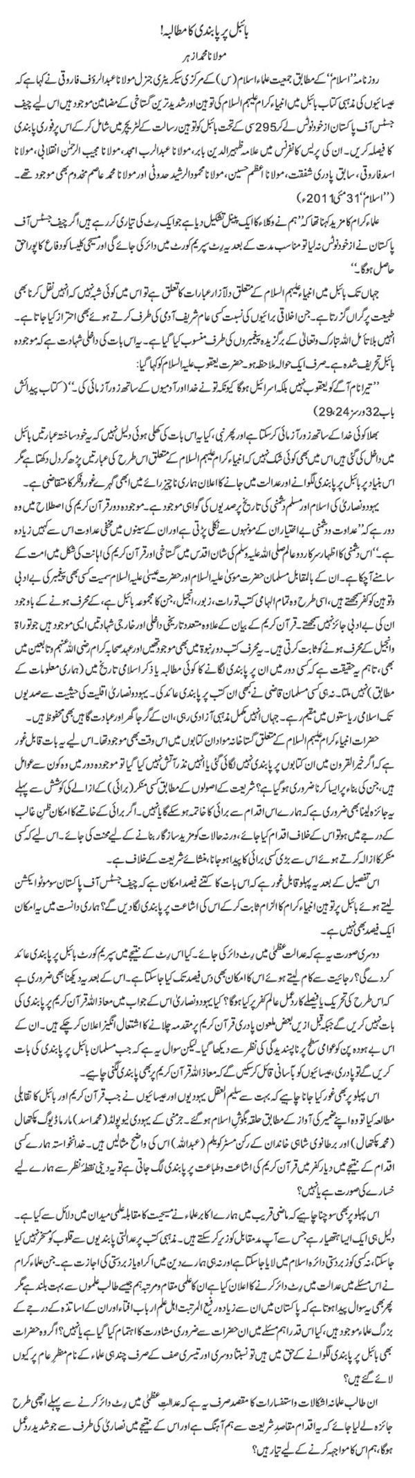 [New Age Islam is posting an English translation of an article (along with the original) by a Pakistan aalim Maulana Mohammad Azhar who opposes the ban on Bible demanded by other Mullas. He says there is no such precedent in Islamic history and so it is needless despite the provocations in the Bible. Such a demand was not made even in the times of the Prophet or his companions or their descendents, he points out. He is also afraid of the reaction of the world Christian community that may lead to banning of the publication of the holy Quran in those countries which will hamper the work of Dawah. – Editor] Christians’ and Jews’ centuries-old hostility for Islam is well known. According to Quran, the present age is the age “when they have a great deal of hatred and jealousy in their heart and will always speak against Islam”. This animosity has come in front of us in the form of blasphemy against Allah and Prophet (PBUH). In comparison to them Muslims take blasphemy against Jesus Christ and Moses as a ‘Kufr’ (disbelief in Islam). This way the Muslims take the denigration of prophets in the Bible as blasphemy. They know the Bible contains deviations; even then they respect it and do not bear its denigration. -- Maulana Mohammad Azhar (Translated from Urdu by Arman Neyazi, NewAgeIslam.com)