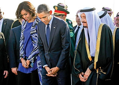 US President Barack Obama and first lady Michelle Obama stand with Saudi Arabia’s King Salman after arriving at King Khalid International Airport in Riyadh on Tuesday. Obama stopped over in Saudi Arabia to pay his condolences over the death of King Abdulllah